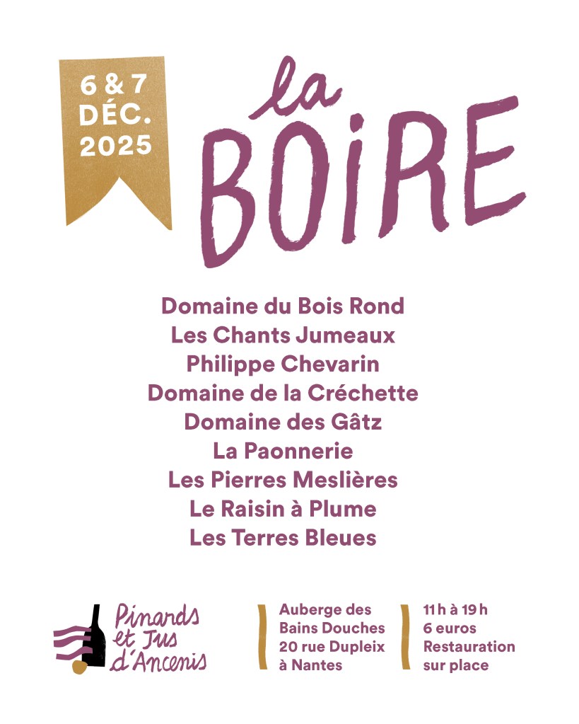 auberge des bains douches, biodynamie, fêtes de fin d'année, la boire 2025, marché de noêl, marché de noêm, nantes, nature, pinard et jus d'ancenis, pineau d'aunis, salons des vins 44, sortir à nantes, vin nature, vin naturel, vins nature